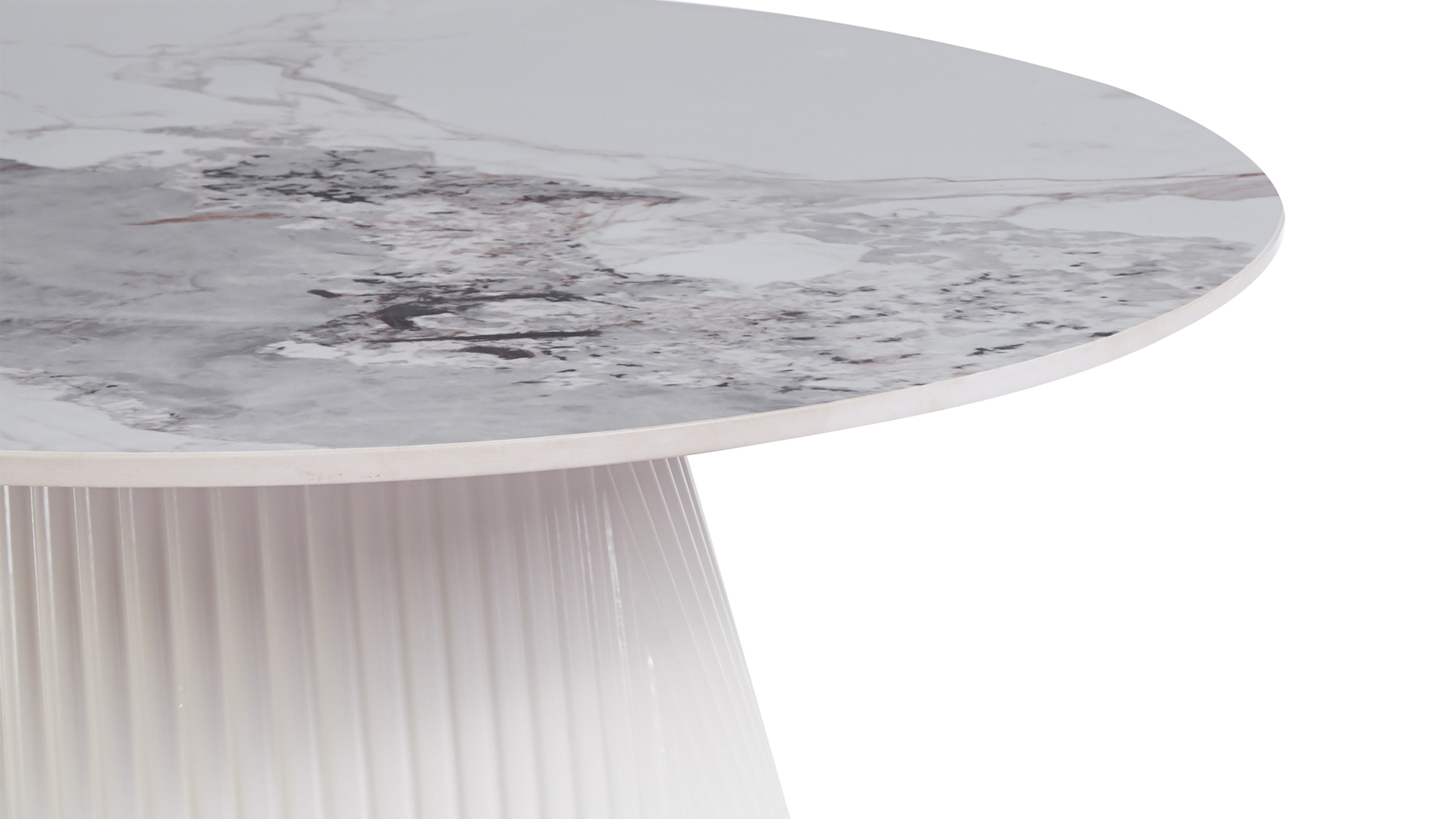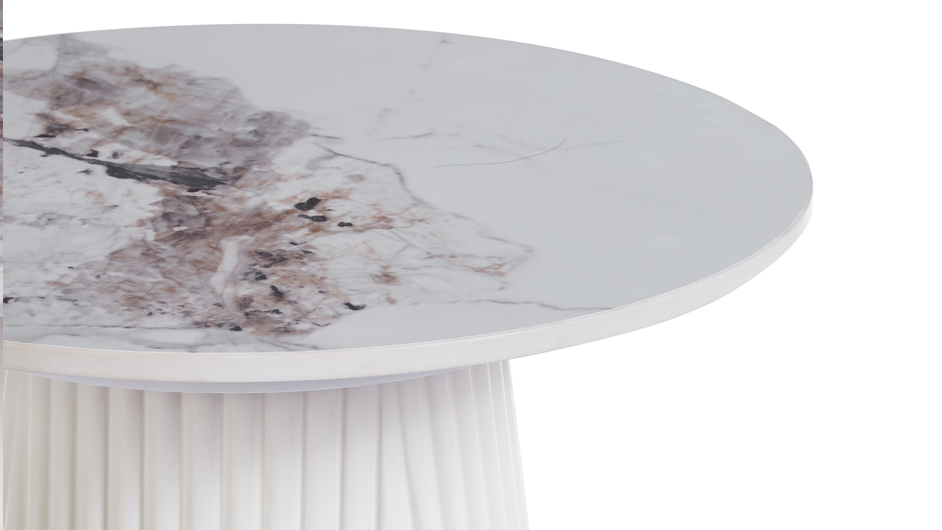 Diseño contemporáneo y líneas puras que elevan cualquier ambiente. Su tapa de cerámica marmolizada combina resistencia y elegancia, mientras la base cónica acanalada en tono blanco aporta textura y carácter. Ideal como complemento junto a un sofá o en espacios de estilo minimalista y luminoso. Una pieza que fusiona arte, funcionalidad y diseño.