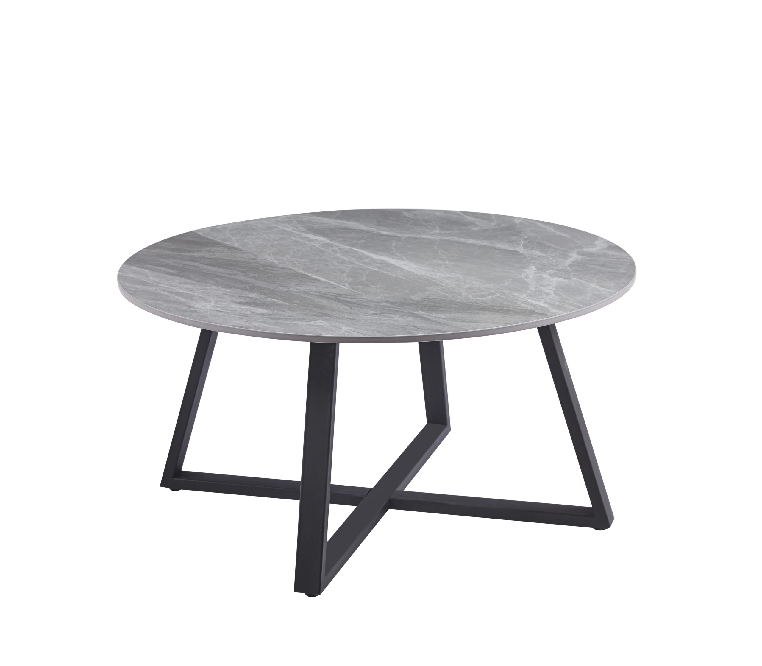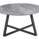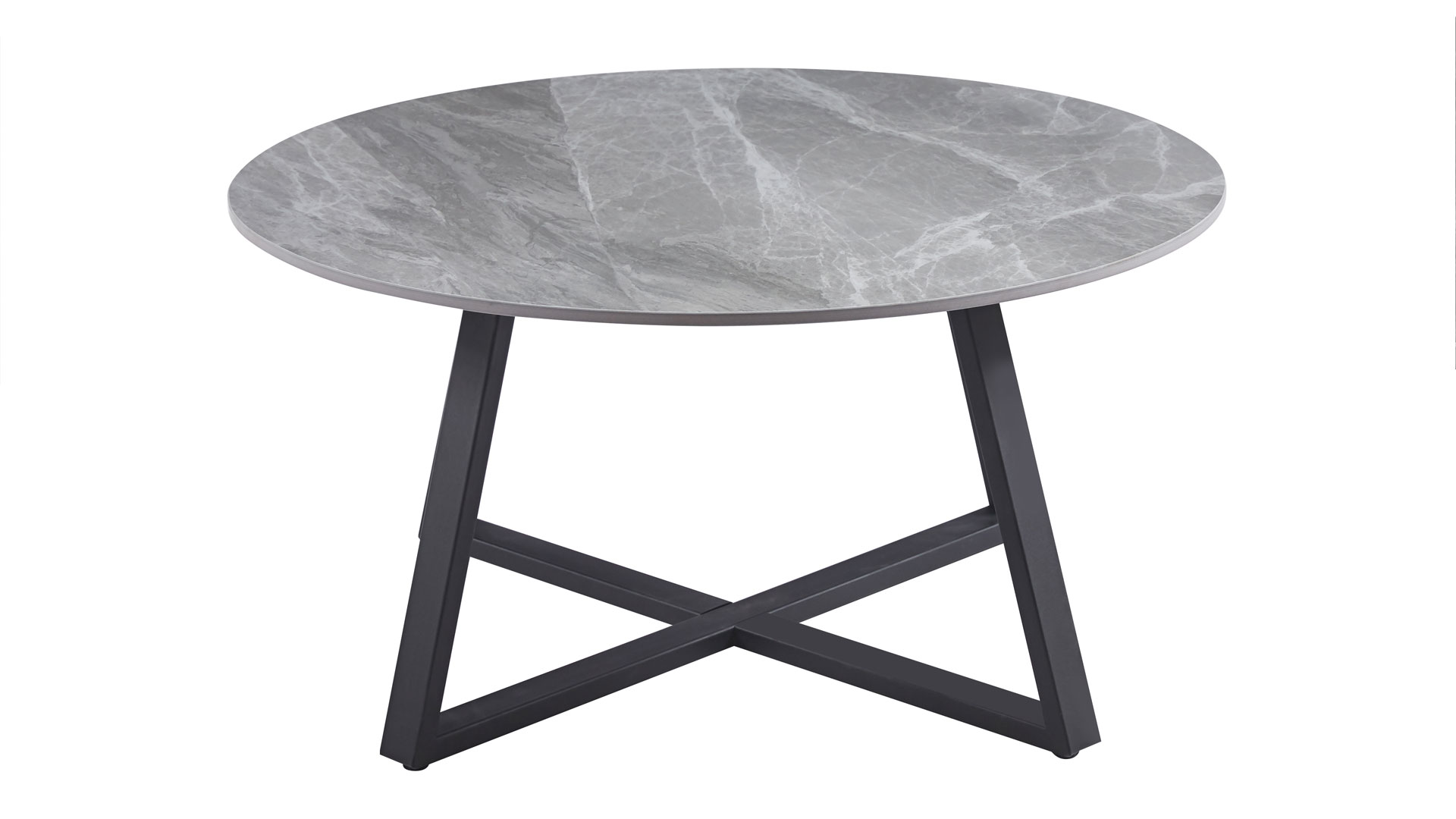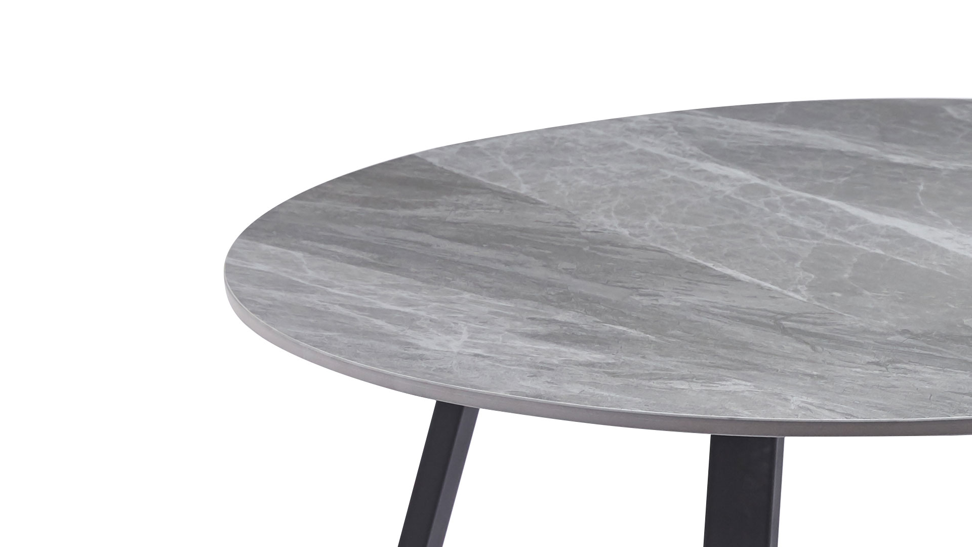 Su tapa de cerámica efecto en tono gris mármol destaca por su textura suave y vetas naturales que aportan profundidad visual. La base metálica en negro mate, con líneas geométricas, crea un contraste contemporáneo que redefine el concepto de equilibrio y estilo.